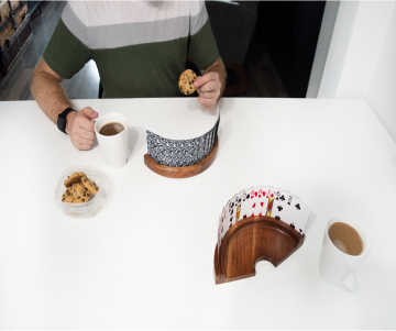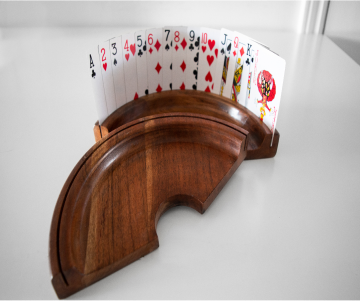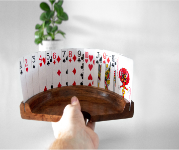 Elevate your game nights with our Premium Wooden Playing Card Holder, crafted from FSC-certified North-American Maple wood to combine durability, eco-friendliness, and style. Designed to hold up to 25 cards, its hands-free, ergonomic design keeps your cards visible and accessible, leaving your hands free for snacks and drinks.